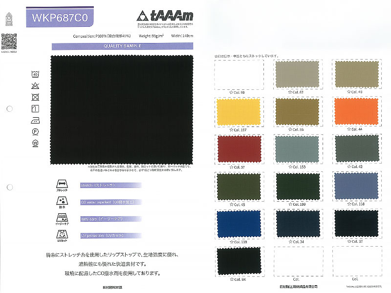 緯糸にストレッチ糸を使用したリップストップで、生地強度に優れ、遮熱性にも優れた快適素材です。環境に配慮したC0撥水剤を使用しております。