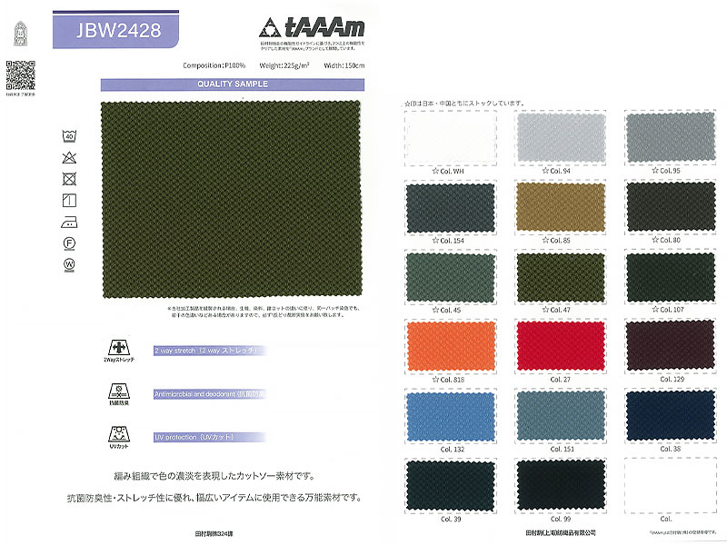 カチオン混トリコット。編み組織で色の濃淡を表現したカットソー素材です。抗菌防臭性・ストレッチ性に優れ、幅広いアイテムに使用できる万能素材です。